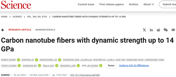 文献链接:Carbon nanotube fibers with dynamic strength up to 14 GPa (Science 2024, 384, 1318-1323)