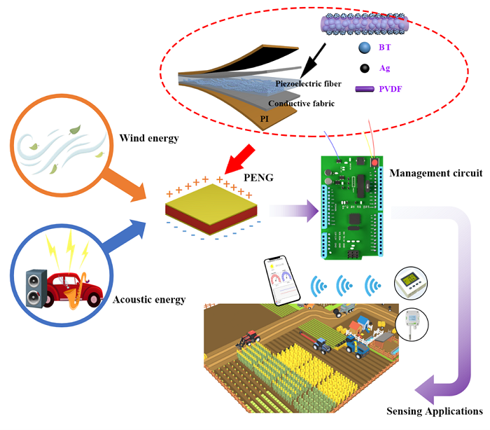 近日,本工作团队科研人员设计了一种基于核壳异质结构复合纤维的PENG器件,该结构材料可通过诱导高有效场极化与改善压电填料间应力传递效率机制双管齐下提高PENG的压电输出;继而,通过合理的能量管理电路设计与PENG结合实现了通过收集自然环境中风能的自供电无线环境监测系统构建(图1)。该压电材料的微观结构是通过附在复合纤维外壳层的钛酸钡包覆银颗粒(BT@Ag)增强压电填料表面的极化电势,同时诱导更多应力从纤维材料外部传递给内部压电填料的机制有效提高输出。其性能增强机理可通过多物理场仿真解释(图2)。基于压电纺丝材料具有柔性、轻质和对型变敏感的特点,研究人员利用基于该材料PENG可有效收集噪音和风力所产生的能量,通过简单的整流电路设计后可为温湿度计、计算器等小型电子设备供能(图3)。更为吸引人的是本工作所设计的PENG可与源管理电路设计、低功耗通信技术和窄带物联网技术(NB-IoT)相结合可实现完全自供电的土壤湿度检测系统的构建(图4)。