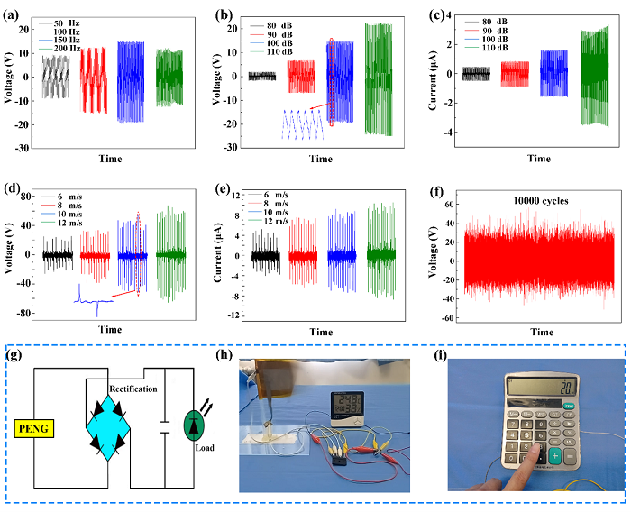 图3 本工作设计的PENG (a)-(c) 对于噪音能量的收集 (d)-(f) 对于风能的收集 (g-i) 经整流电路设计实现为小型电子设备供能