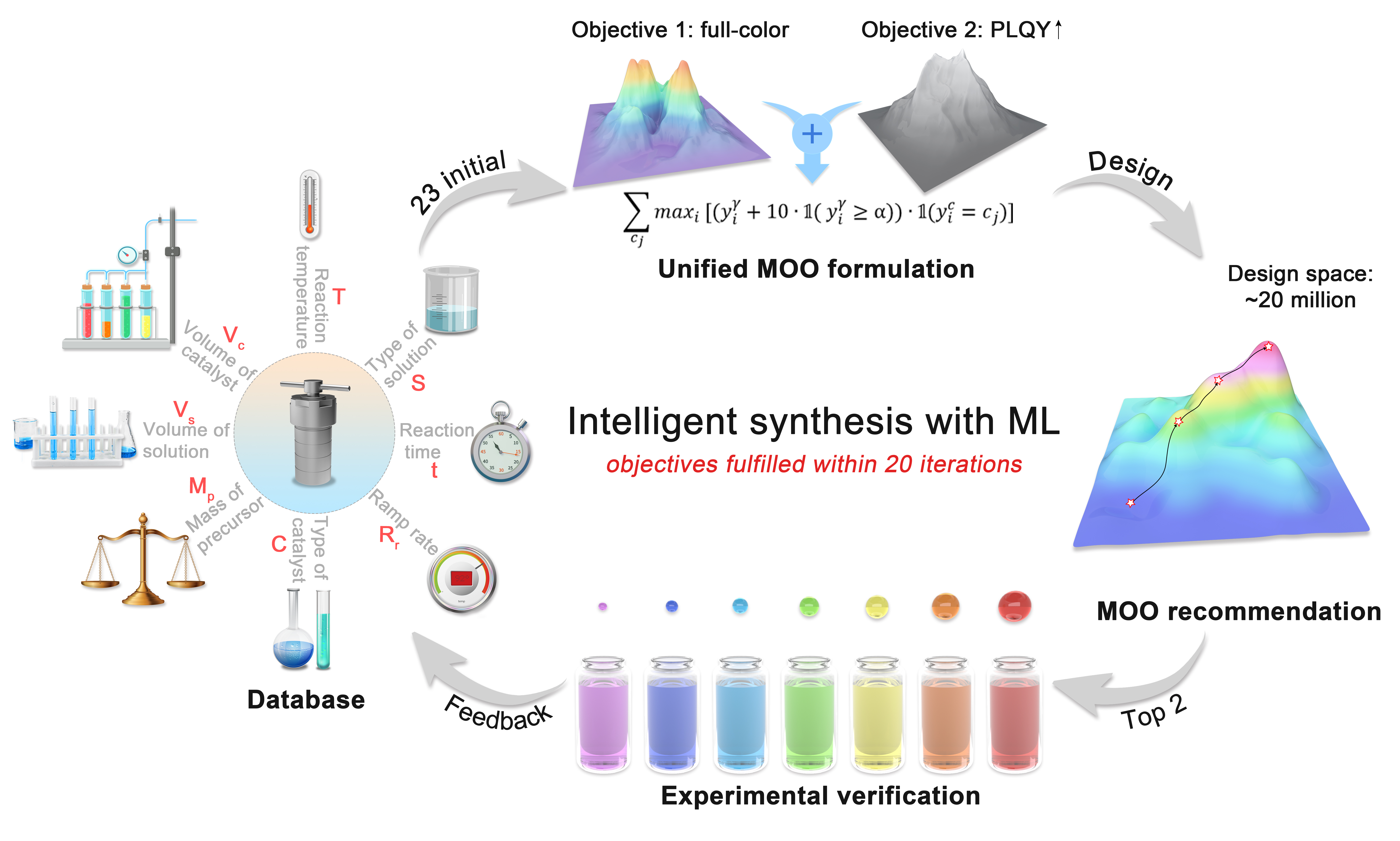 图2. 基于ML的MOO策略指导下的全色荧光碳量子点合成评价
