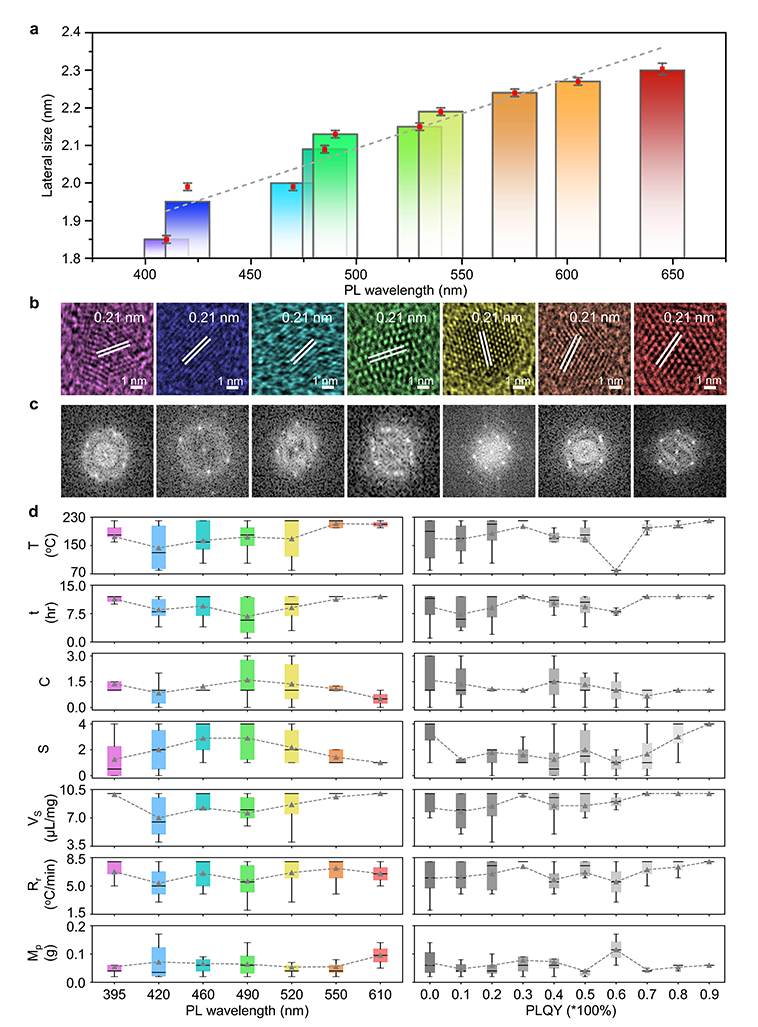 图4. 全色荧光碳量子点的形态表征及合成参数与光学性质的关系分析