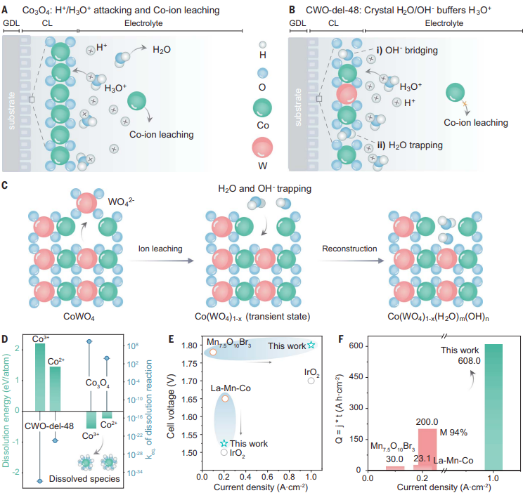析氧反应(OER)在一系列清洁能源储存和转化过程(电解水金属空气电池)中起着关键作用。这种四电子氧化反应需要连续的中间价态变化步骤,这使得催化循环的动力学变得十分复杂,并表现出缓慢的整体催化动力学。在质子交换膜水电解(PEMWE)中,贵金属通常是该反应稳定催化所必需的。由此产生的催化剂实现了较低的过电势,在2伏电压下电流密度为1.8安培/平方厘米,并且在工业条件(80°C)、1.77伏电压下在PEMWE系统中稳定运行高达1安培/平方厘米;活动能力提高三倍;并在每平方厘米1安培的电流下稳定运行600小时。西班牙巴塞罗那HTH官网地址 学院F. Pelayo García de Arquer团队报道了氢氧化水在钨酸钴中捕获用于质子交换膜电解,相关研究成果以 “Water-hydroxide trapping in cobalt tungstate for proton exchange membrane water electrolysis”为题目发表在国际顶级期刊Science上。