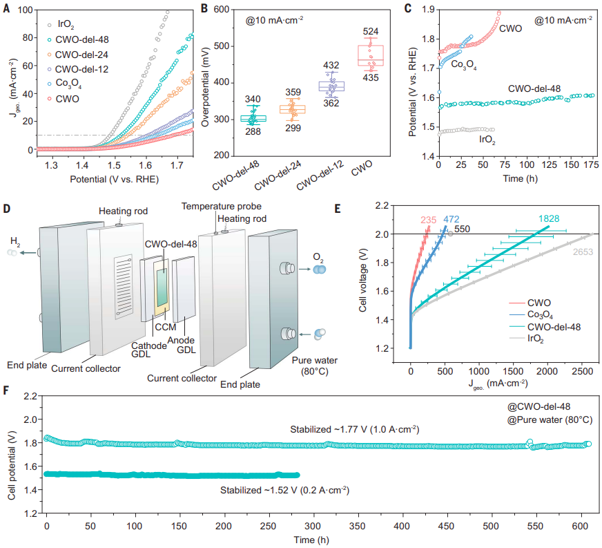 1.通过剥离钴钨酸盐,实现了在酸性环境中稳定氧化物和水-氢氧根网络的缺陷晶格,从而显著提高了催化剂的活性和耐久性。