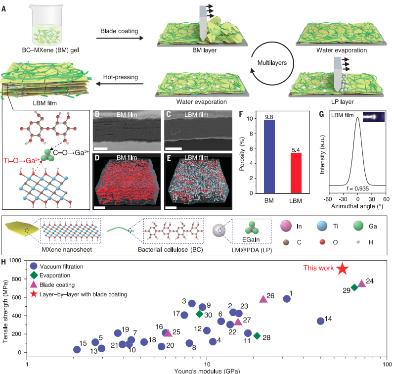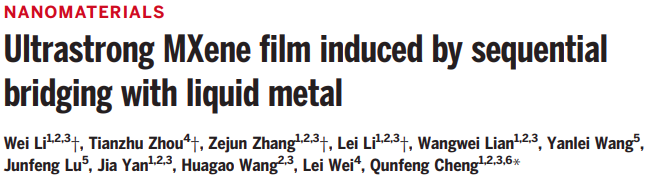 Mxene材料具有优异的导电性和机械性而备受关注。传统的Mxene薄膜制备方法存在着一些问题,例如成本高、工艺复杂等。为了解决这些问题,研究人员提出了一种新的制备方法——液态金属顺序桥联法。该方法利用液态金属在Mxene表面形成一层金属膜,通过顺序桥联反应将金属膜与Mxene层连接在一起,形成超强Mxene薄膜。北京航空航天大学的程群峰教授团队,魏立,周天柱(博士后)、张泽军(博士研究生)、李雷(博士研究生)作为共同一作,报道了采用刮刀涂覆的方法制备取向度为0.75的MXene薄膜,拉伸强度可达570 Mpa。发展了一种空间受限蒸发方法,进一步将Mxene纳米片的取向度提高到0.99,所得到的Mxene薄膜的拉伸强度为707 Mpa。空洞和界面相互作用也是提高MXene薄膜应力传递效率的重要因素,相关研究成果以 “Ultrastrong MXene film induced by sequential bridging with liquid metal”为题目发表在国际顶级期刊Science上。