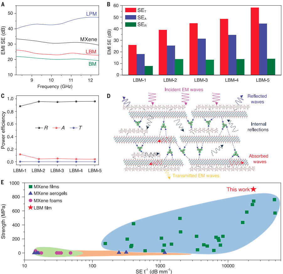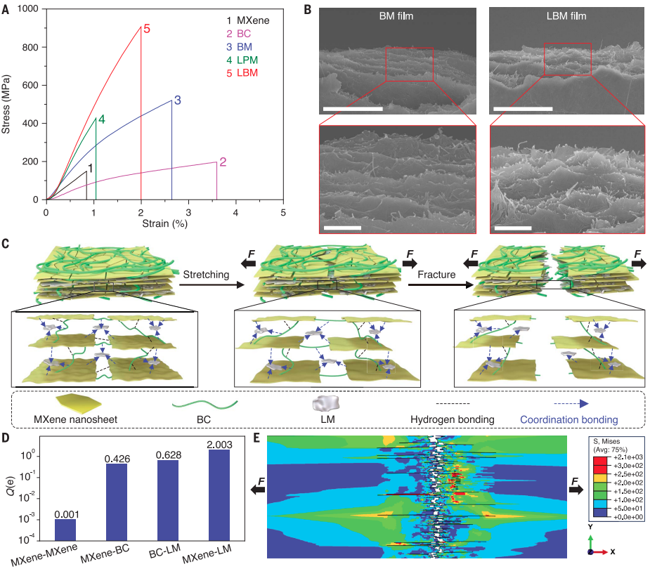 本文用LM(液态金属)和BC(细菌纤维素)连续桥联MXene纳米片,制备了超强宏观LBM薄膜。该纳米颗粒有效地减少了LBM膜的空洞。通过BC的氢键和与LM的配位键,MXene纳米片之间的界面相互作用得到了极大的加强。这些结果进一步提高了MXene纳米薄片在LBM薄膜中的应力传递效率。此外,LBM薄膜具有较高的电磁屏蔽效率。该方法提出的使用LM和BC的制造策略减少了空洞并提高了应力传递效率,这可能使其他二维纳米片组装成高性能材料成为可能。