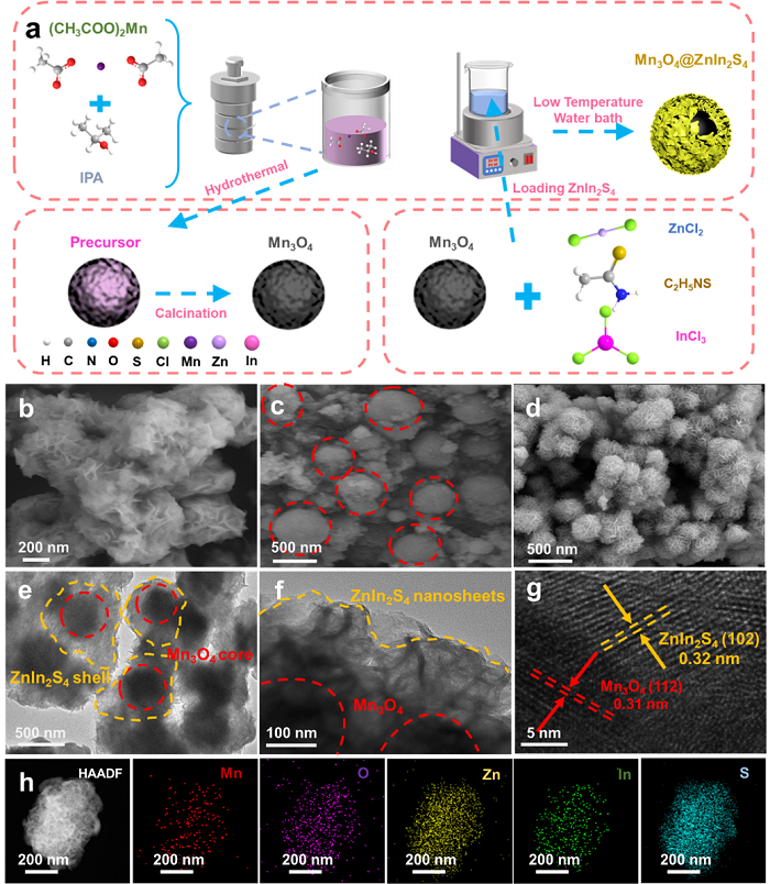图1. (a) MO@ZIS核壳异质结的合成示意图。(b) ZIS,(c) MO和(d) MO@ZIS-30的SEM图像。MO@ZIS-30异质结的(e,f)TEM,(g) HRTEM,(h) HAADF-STEM图像及相应元素映射。