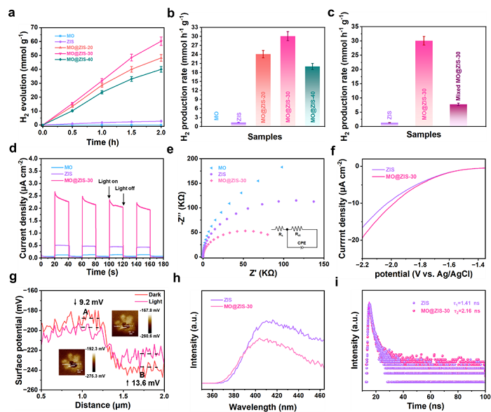 图3. (a) 全光谱光照射下ZIS、MO和MO@ZIS的光催化制氢曲线和 (b) 制氢速率。(c) MO@ZIS-30的光催化制氢速率与机械混合时对比。ZIS和MO@ZIS-30的 (d) 瞬态光电流响应,(e) EIS和 (f) LSV曲线。(g) MO@ZIS-30在黑暗和光照下的SPV光谱(插图为KPFM图像)。(h) 制备样品的PL光谱和 (i) TRPL荧光发射光谱。
