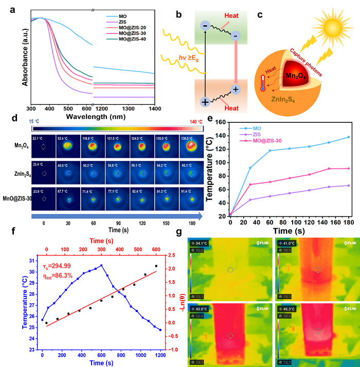 图4. 所有光催化剂的 (a) 紫外-可见-近红外吸收光谱。(b) 在MO中的非弛豫辐射过程的示意图。(c) MO@ZIS核壳异质结的传热效应。(d) 已制备材料在光照下的温度映射图像和 (e) 相应的温度变化曲线。MO@ZIS-30的 (f) 光热转换效率。(g)光催化制氢过程中的光热红外图像。