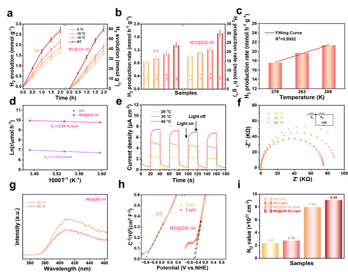 图5. ZIS和MO@ZIS-30在不同反应温度下的 (a) 制氢活性和 (b) 制氢速率。MO@ZIS-30 (c)在不同温度下光催化制氢速率与反应温度的关系及 (d) 活化能的计算。MO@ZIS-30在不同温度条件下的 (e) 瞬态光电流响应曲线,(f) EIS图谱和 (g) PL光谱。ZIS和MO@ZIS-30在光照和黑暗条件下的 (h) 莫特肖特基和 (i) 计算的ND值。