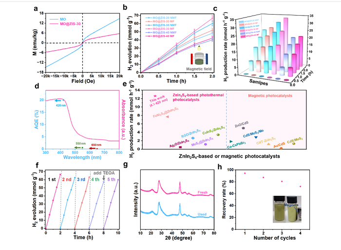 图6. (a) MO和MO@ZIS-30的磁滞回线。MO@ZIS-30在磁场下相应的 (b) 光催化制氢活性和 (c) 制氢速率。(d) MO@ZIS-30在420, 550和650 nm波长处的AQE。(e) MO@ZIS-30与最近报道的光热和磁场诱导光催化剂制氢性能对比。(f) 循环制氢实验。(g) 反应前后的XRD谱图。(h) MO@ZIS-30的磁性可回收率和磁性分离特性。