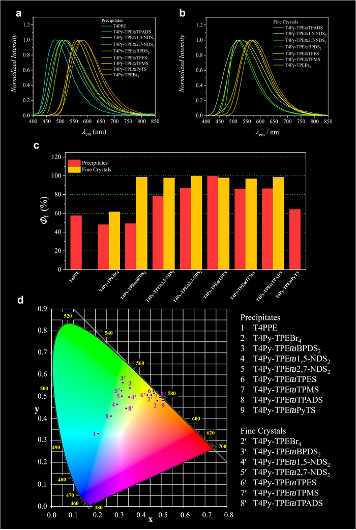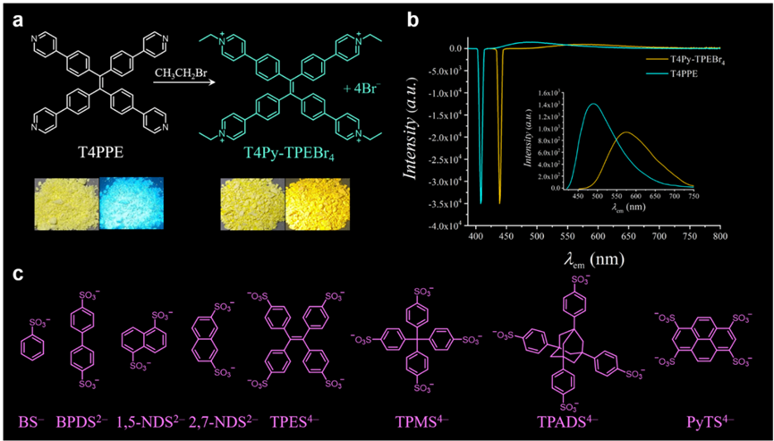 该成果报道了一种简单高效的策略,通过将四吡啶基四苯乙烯(T4Py-TPE4+)这一阳离子发光体与七种阴离子芳香磺酸盐配体结合(图1),构建发光有机盐。当将阳离子发光体与阴离子配体的水溶液混合时,它们在几秒到几分钟内迅速聚集成有机盐,以T4Py-TPE₪TPADS和T4Py-TPE₪1,5-NDS2盐的复合过程为例(图2),可以观察到明显的荧光增强。这些有机盐的量子产率高达90%以上,此过程伴随着发光效率从约58%增加到几乎100%,并且能够调节发光颜色在511到586 nm之间(图3)。这些改进主要归因于阳离子与阴离子之间的强静电吸引力,导致T4Py-TPE4+发光体形成具有不同共轭长度的刚性疏水网络。由于这些化合物是市售的,这一方法为制造新型发光材料用于设备制造和研究提供了可能性。