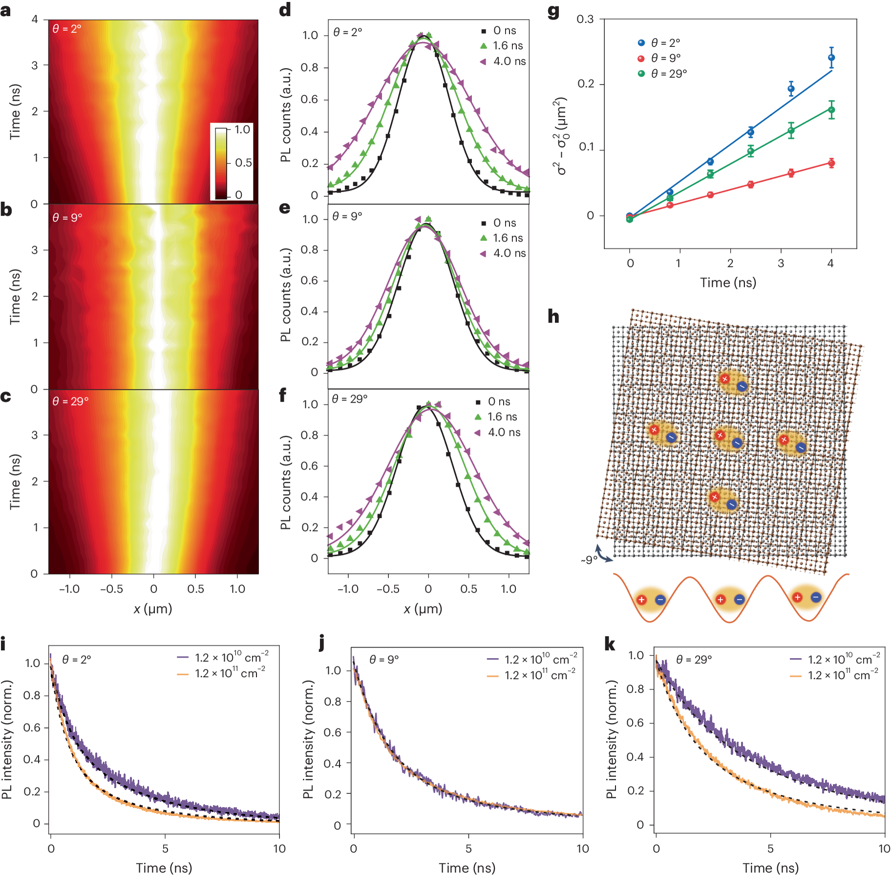 图3. MAPbI3扭转钙钛矿层中与扭转角相关的激子输运和湮灭。© 2024 Springer Nature