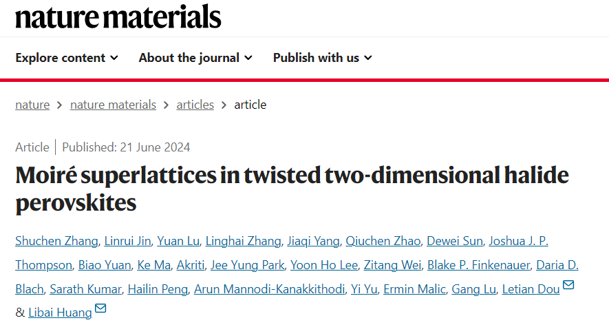 原文详情:Zhang, S., Jin, L., Lu, Y. et al. Moiré superlattices in twisted two-dimensional halide perovskites. Nat. Mater. (2024). https://doi.org/10.1038/s41563-024-01921-0。