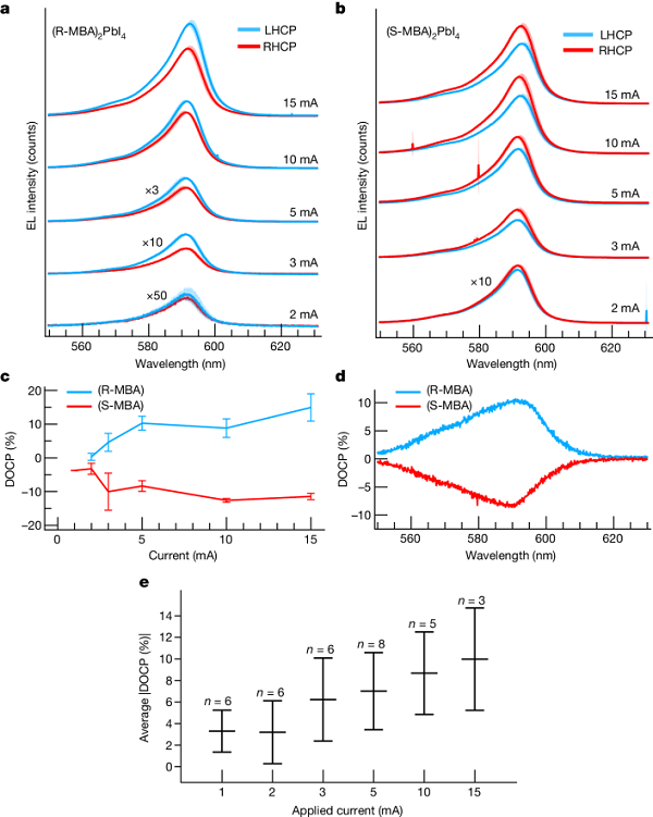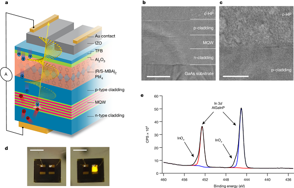 图2 (R/S-MBA)2PbI4/(AlxGa1−x)0.5In0.5P自旋LED的CP-EL发射 © 2024 Springer Nature