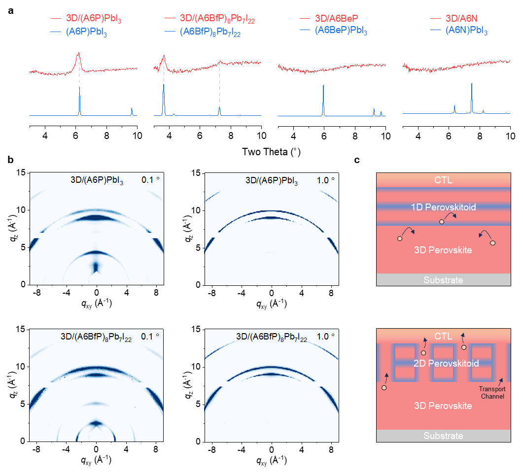 (A6P)PbI3、(A6BfP)8Pb7I22、A6BePI和A6NI表面钝化的钙钛矿样品的XRD图谱(上),以及(A6P)PbI3、(A6BfP)8Pb7I22、(A6BeP)PbI3和(A6N)PbI3的理论XRD图谱(下)。b.不同入射角下的一维(1D)(A6N)PbI3/3D钙钛矿和2D (A6BfP)8Pb7I22/3D钙钛矿异质结薄膜的GIWAXS图谱。c. 1D (A6N)PbI3和2D (A6BfP)8Pb7I22结构在3D钙钛矿薄膜上的结晶取向示意图。