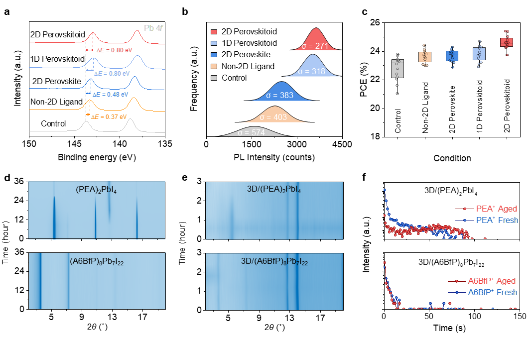 高分辨率Pb 4fXPS峰和b. 由非2D配体、2D钙钛矿(PEA)2PbI4和2D类钙钛矿材料(A6BfP)8Pb7I22钝化的3D钙钛矿薄膜的PL强度统计,σ为标准偏差。c. 不同钝化策略下PSCs的效率统计。d. 在85% RH和85°C下(PEA)2PbI4和(A6BfP)8Pb7I22薄膜的时间依赖XRD图谱。e. 在85% RH和85°C下2D (PEA)2PbI4和2D (A6BfP)8Pb7I22钝化的3D钙钛矿薄膜的时间依赖XRD图谱。f. 在85% RH和85°C下老化3小时前后,2D (PEA)2PbI4/3D钙钛矿和2D (A6BfP)8Pb7I22/3D钙钛矿的飞行时间二次离子质谱分析。