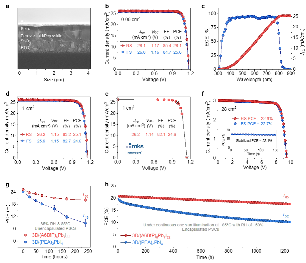 PSCs的截面SEM图像。b.最高效小面积器件的J-V特性。c. 基于2D类钙钛矿材料/3D钙钛矿的器件的EQE曲线和积分电流密度。d. 最高效大面积(>1 cm2)器件的J-V曲线。e. Newport认证的基于(A6BfP)8Pb7I22钝化的1 cm2器件的渐进式准稳态J-V曲线。f. 孔径面积为28 cm2的钙钛矿光伏组件的J-V曲线和稳态输出性能。g. 在85% RH和85°C下未封装小面积器件稳定性。h. 在暴露空气,100 mW cm-2的连续光照,和85°C持续加热条件下的1 cm2器件的最大功率点追踪。