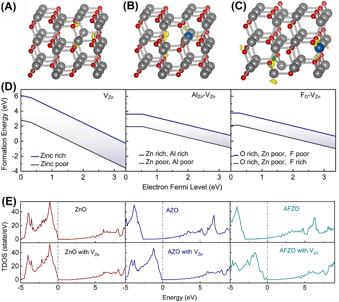 图 3. 掺杂ZnO的稳定结构和差分电荷密度:(A)含有VZn的 ZnO,(B)含有AlZn的AZO,以及(C)含有VZn的AFZO。VZn位于仅剩两个锌原子的列上。图中灰色、红色、蓝色和绿色球分别代表锌、氧、铝和氟原子。(D)ZnO 中VZn、AlZn−VZn和FO−VZn缺陷的形成能。阴影区域以渐变色展示不同条件下形成能的变化区间。(E)ZnO、AZO 和 AFZO 中有无VZn缺陷的态密度。