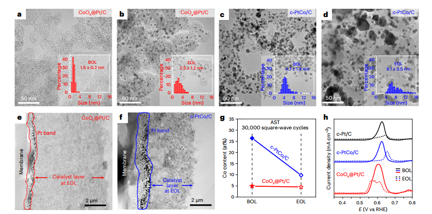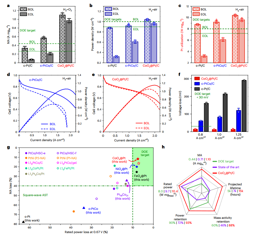 图3 CoOx@Pt/C、C-PtCo/C和C-Pt/C催化剂的MEA性能;© Springer Nature Limited 2024