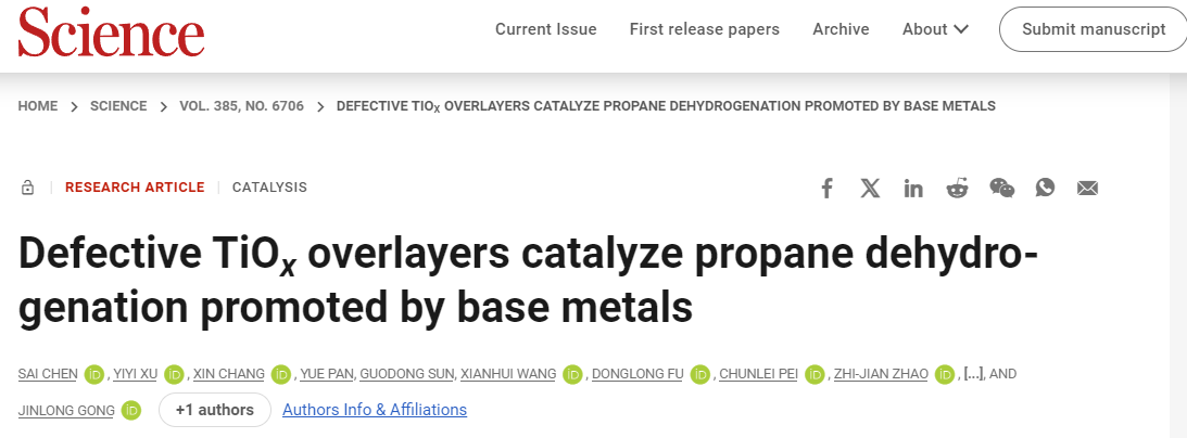 原文详情:Sai Chen et al., Defective TiOx overlayers catalyze propane dehydrogenation promoted by base metals. Science 385, 295-300(2024).