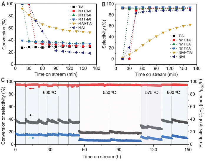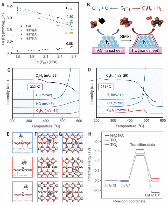 图2 Ni/Al2O3、TiOx/Al2O3和Ni@TiOx/Al2O3催化剂的PDH催化性能@2024 AAAS