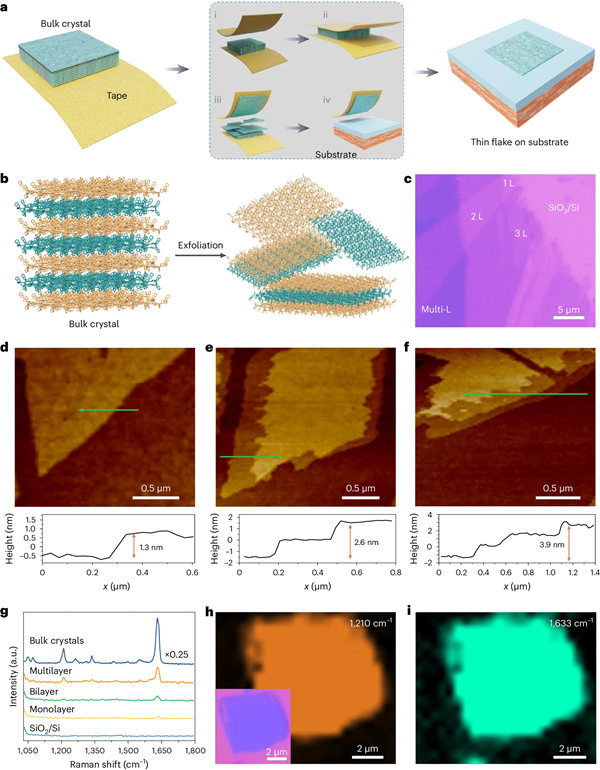 受石墨烯剥离制备的启发,研究人员尝试了采用机械剥离的方法对大块的晶体进行剥离,最终成功得到了不同层数的薄层分子编织聚合物纳米片,单层厚度仅为1.3 nm。