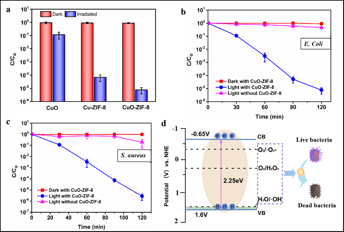 图2. CuO-ZIF-8的光催化灭菌效果。(a)比较了CuO、Cu-ZIF-8和CuO-ZIF-8的杀菌性能。(b, c)CuO-ZIF-8存在下大肠杆菌和金黄色葡萄球菌的失活动力学。(d)CuO-ZIF-8的能带位置与ROS形成电位的关系。
