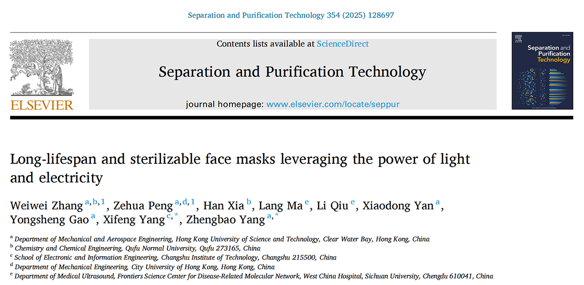 迅速变异的病毒和日益恶化的空气污染导致了对口罩的巨大需求。然而,大多数商用口罩在长时间过滤空气颗粒物的能力上存在局限,并且无法灭活病原体。然而,如何同时实现长时间有效的过滤和灭活细菌一直是个难题。香港HTH官网地址 大学杨征保教授团队在《Separation and Purifcation Technology》期刊发表名为“Long-lifespan and Sterilizable Face Masks Leveraging the Power of Light and Electricity”的论文,研究报告了一种基于光(CuO-ZIF-8的光催化作用)和电(PVDF-TrFE的压电性)协同效应的高度杀菌、自充电和长寿命的口罩。该口罩通过利用PVDF-TrFE纳米纤维膜的高压电性能使其自动充电并增强静电吸附能力。此外,利用CuO-ZIF-8通过绿色可再生的太阳能进行光催化杀菌,是一种低碳、无毒的技术。