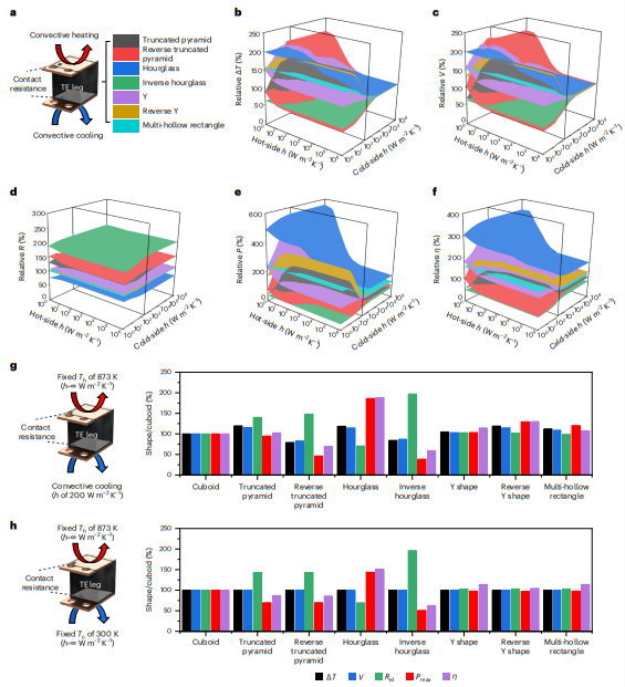 这些实验结果与不同热环境条件下3D图中的模拟结果一致(图2a-e),对应于200 W m-2 K-1的恒定冷却h和无限大的加热和冷却h。这种一致性表明了几何结构在各种工作条件下对器件发电效率的影响。
