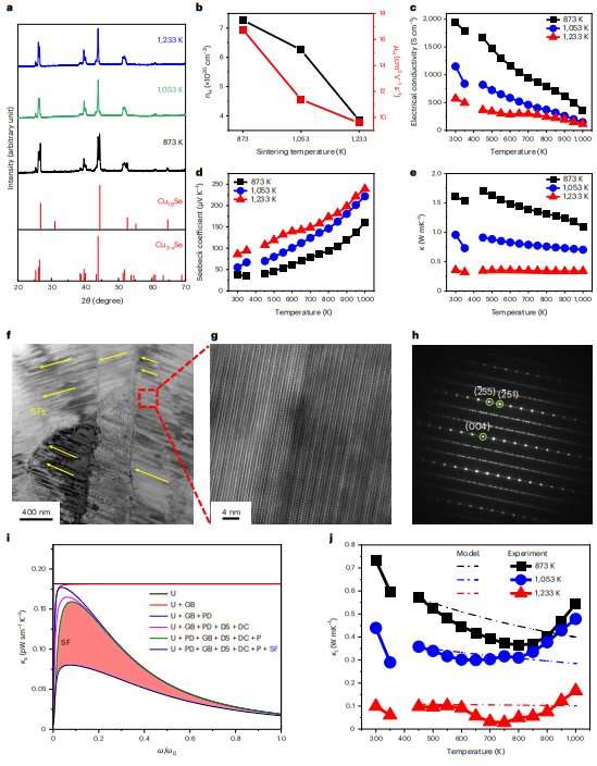 在873,1053和1233 K烧结的样品的X射线衍射(XRD)图谱显示,在873 K烧结的样品中观察到了Cu1.8Se相和Cu2Se相的混合相,并且随着烧结温度的升高,Cu1.8Se相的峰逐渐消失(图5a)。在1233 K时,XRD图谱只显示出与Cu2Se体相相对应的峰,没有任何与Cu1.8Se相相关的峰。本工作在873,1053和1233 K下测量了3D打印、热处理样品从室温到1000 K的温度依赖的热电性能。在本工作的样品中形成富Se的Cu2-xSe相可以控制样品的空穴浓度,因为Cu2-xSe中的Cu空位可以作为空穴供体(图5b)。样品的空穴迁移率也随着烧结温度的升高而降低。这种趋势可以通过考虑在较高温度下烧结样品中的缺陷形成来理解。