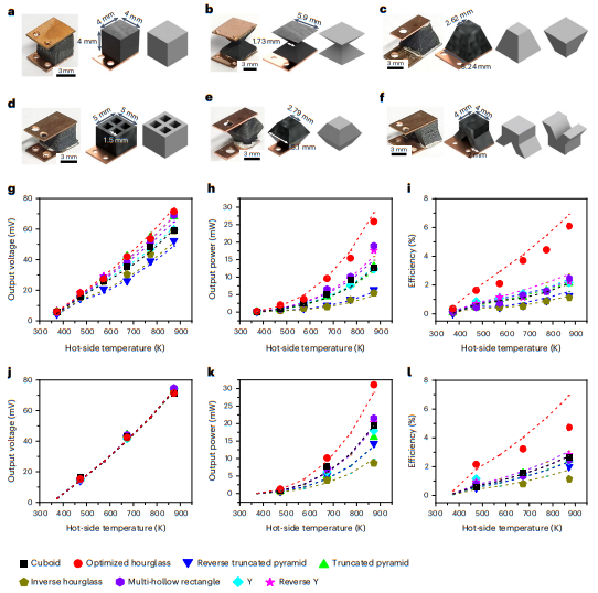 为了实验验证本工作的设计,本工作3D打印了8种不同几何形状的Cu2Se,这些Cu2Se被Ni扩散阻挡层和Cu板电极夹在一起,使用Ag焊膏作为焊料(图6a-f)。在固定Th和对流冷却条件下,随着温度的升高,所有器件的ΔT和V几乎呈线性增加,Pmax呈二次曲线增加,表明了测量的可靠性。此外,在固定的ΔT条件下,所有样品在测量温度范围内表现出几乎相同的输出电压(图6j-1)。这些结果证明了在不同的工作条件下,几何形状对提高发电性能的影响。