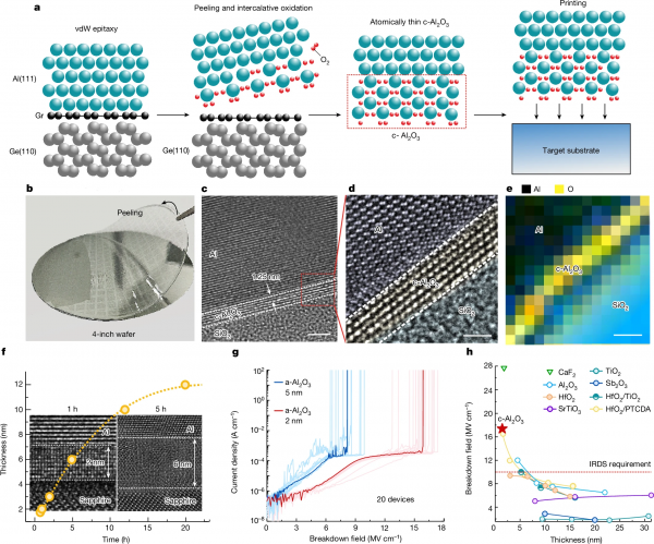 为了解决相关技术难题,研究人员开发了一种创新的金属插层氧化技术。这项技术的核心在于能在室温下,精准操控氧原子逐层嵌入铝的晶格中,形成有序的单晶氧化铝介质材料——蓝宝石。这种材料在微观层面上的有序排列,确保了电子在传输过程中的稳定性,使得即使在仅有1纳米的厚度下,依然能够有效阻止电流的泄漏,从而显著提高了芯片的能效。
