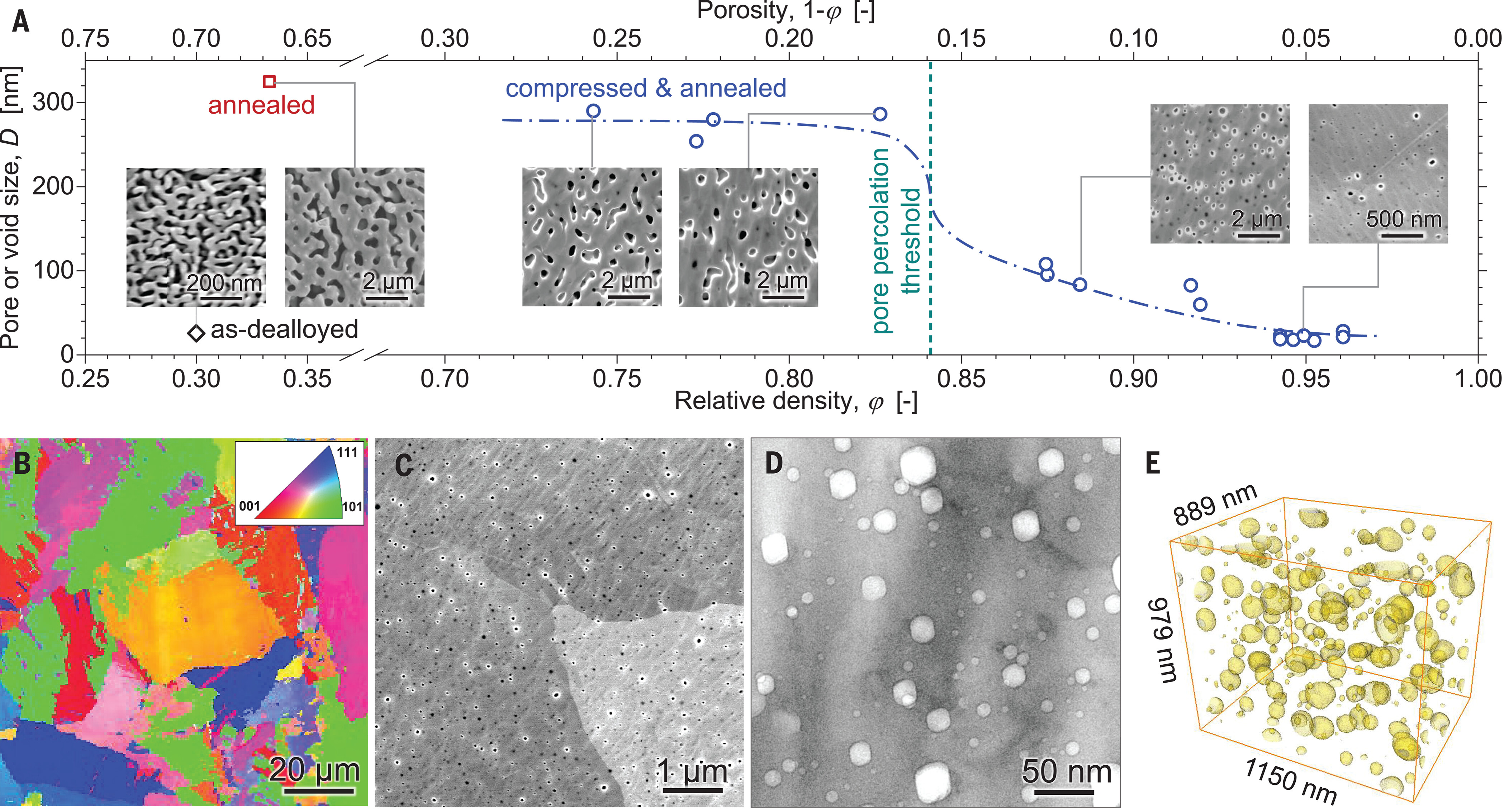 基于以上研究背景,中科院金属所金海军教授(通讯作者)等人发现当金属中的孔隙收缩到亚微米或纳米尺度时,分散的纳米孔可以在减轻重量的同时,增加材料的强度和延展性。他们通过一系列加工过程,包括腐蚀、压缩和热退火,将纳米孔隙引入纯金中,为开发新型轻质、高性能材料提供了一种廉价、环保的方法。相关研究成果以“Strengthening gold with dispersed nanovoids”为题发表在最新Science期刊上。