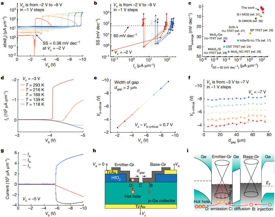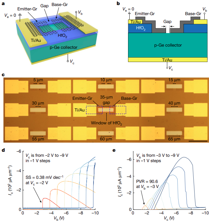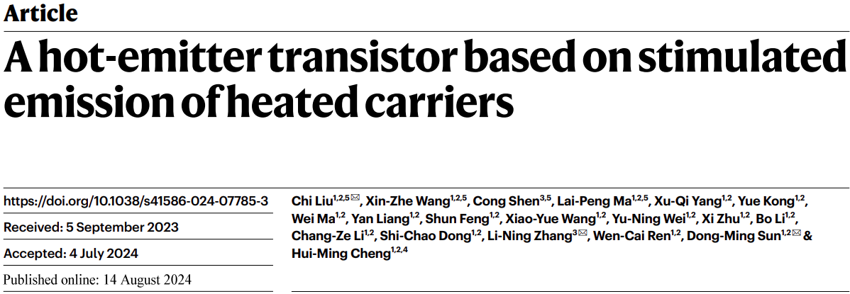 随着通信、微波和光电子技术的迅速发展,对高效能、高速度和低功耗的器件需求日益增加,受热载流子受激发射的热发射极晶体管因其优越的性能特点而备受关注,并逐渐成为各个领域的研究热点。其工作原理是利用载流子在半导体中受热激励后产生的热发射现象,从而实现电子的发射和控制。与传统的晶体管相比,受热载流子受激发射的热发射极晶体管具有更高的电流传输效率和更低的功耗,能够实现更高的频率和更快的响应速度。这种器件对于需要快速切换和高频操作的应用至关重要,例如先进的电信和尖端的计算技术。然而,热载流子产生的传统机制是载流子注入或加速,这限制了器件在功耗和负微分电阻方面的性能。中国科学院金属研究所刘驰研究员等人报道了一种基于双混合维石墨烯/锗肖特基结的混合维热发射极晶体管(HOET),使用加热载流子的受激发射来实现低于玻尔兹曼极限。通过利用能带组合形成的不同势垒,可以提供不同的热载流子产生机制。相关研究成果以 “A hot-emitter transistor based on stimulated emission of heated carriers”为题目发表在国际顶级期刊Nature上。