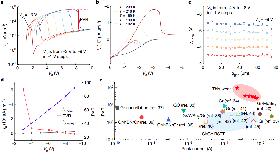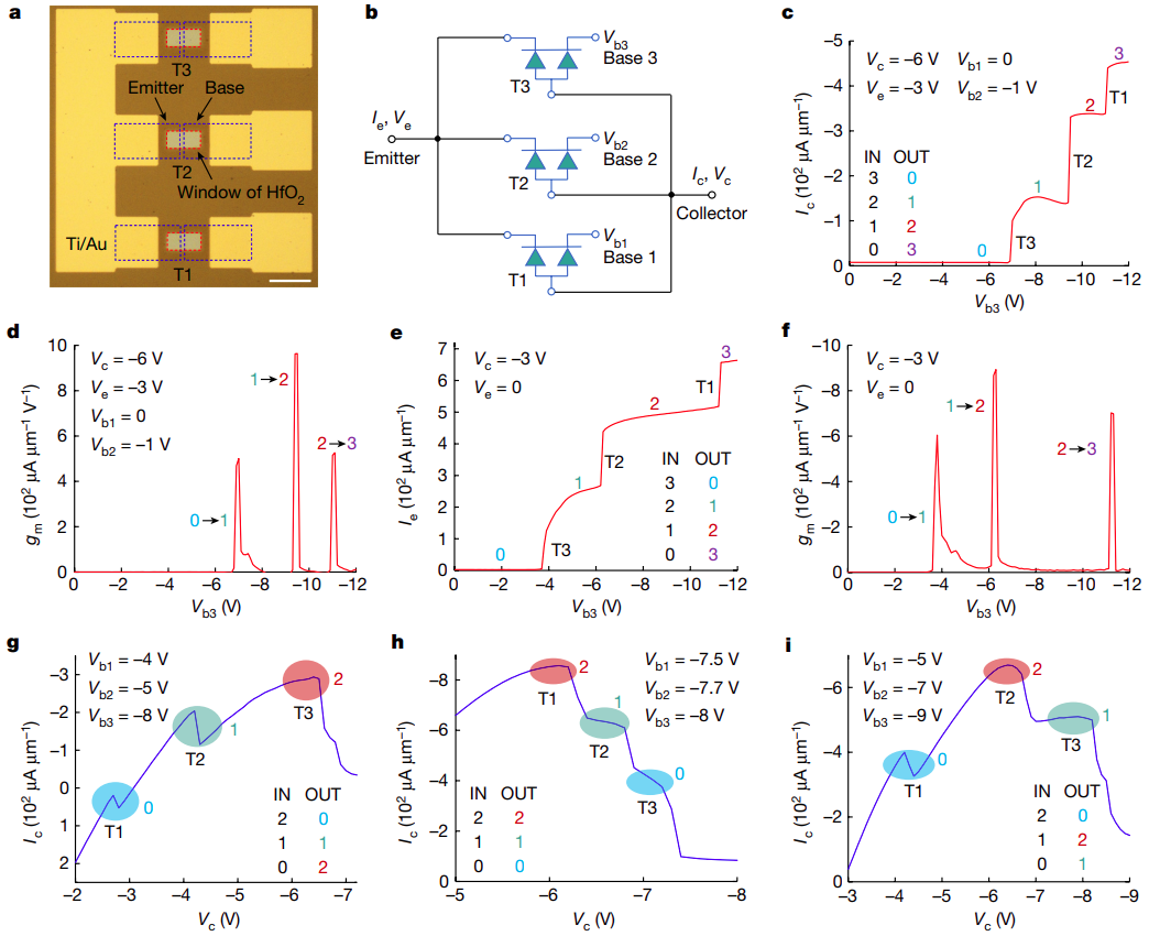 - 利用热载流子的受激发射,HOET晶体管在室温下实现了低于1 mV dec−1的亚阈值摆幅和峰谷电流比大于100的NDR。具有高反相器增益和可重构逻辑状态的多值逻辑的应用。