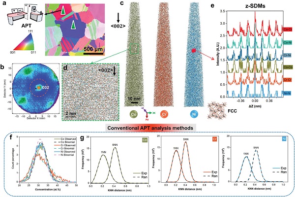 图2 CoCrNi合金在1273K退火120小时后的典型APT数据及其常规数据分析方法。(a) EBSD图突出了用于APT实验的晶粒。(b) 代表性的二维探测器命中图。 (c) 沿<002>方向的精确三维APT重构图。(d) (c)中沿<002>方向的一个薄切片的局部特写。(e) (c)中一个代表性体素中不同元素对的z-SDM图。其特征对应于面心立方(fcc)结构。两种传统的APT分析方法:(f) Co、Cr和Ni原子的频率分布分析,与二项式随机分布进行比较;以及(g) Co-Co、Cr-Cr和Ni-Ni元素对的k最近邻距离分析(k=1和5)。