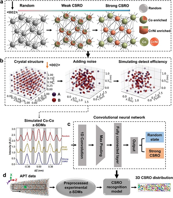 近日,马普钢铁所的李跃博士牵头,与多家科研单位合作,引入了一种名为ML-APT的方法,以克服APT数据中各向异性的空间分辨率和不完美的探测效率问题。这一方法用于对CoCrNi合金中的化学短程有序结构进行三维量化,且无需任何先验的CSRO配置知识。总体流程如图1所示。ML-APT不仅能够识别CSRO,还能量化有序结构的数量密度、配置、元素位置占据以及尺寸和形态。随后,研究团队利用蒙特卡罗模拟验证了其分析结果,以深化对有序反应机制的理解。最终,他们展示了如何建立加工参数、CSRO与材料性能之间的直接关系,为材料设计提供了新的可能性。这项研究成果以“Machine Learning-Enabled Tomographic Imaging of Chemical Short-Range Atomic Ordering”为题,发表在国际著名期刊《Advanced Materials》上。李跃博士为第一作者和主要通讯作者,中南大学的王章维教授、马普所的龚逸伦博士以及Baptiste Gault教授为论文共同通讯作者。论文DOI:https://doi.org/10.1002/adma.202407564。