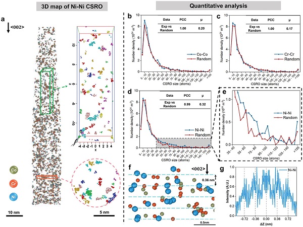 图4退火CoCrNi合金中沿<002>方向分布的CSRO的3D定量分析结果。(a) Ni-Ni CSRO的3D分布及元素映射。 (b), (c), (d) 分别为识别出的Co-Co、Cr-Cr和Ni-Ni CSRO的尺寸分布。结果与化学随机化数据集进行比较,并用Pearson相关系数(PCC)和Pearson列联系数(µ)进行分析。 (e) (d)中区域的局部放大。(f) 从(e)中提取的典型Ni-Ni CSRO域的3D原子图。(g) 其对应的Ni-Ni z-SDM。