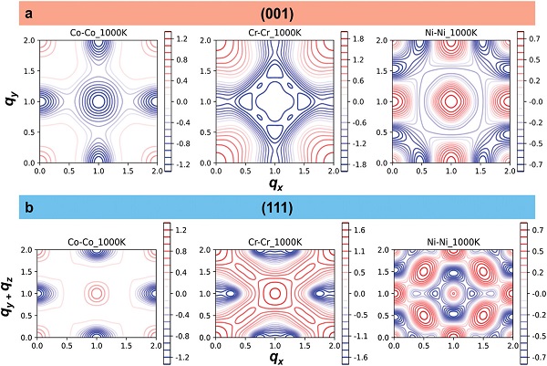 图6蒙特卡罗模拟预测的CSRO。(a) 和 (b) 分别为在1000K下Co-Co、Cr-Cr和Ni-Ni对在(001)和(111)平面中的预测CSRO弥散强度图α_q。倒易空间向量以2π/a为单位表示,其中a是晶格参数。