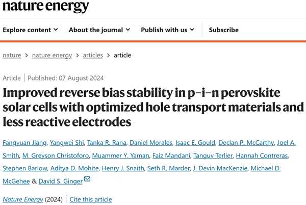 原文详情:Improved reverse bias stability in p-i-n perovskite solar cells with optimized hole transport materials and less reactive electrodes (Nat. Energy 2024, DOI: 10.1038/s41560-024-01600-z)