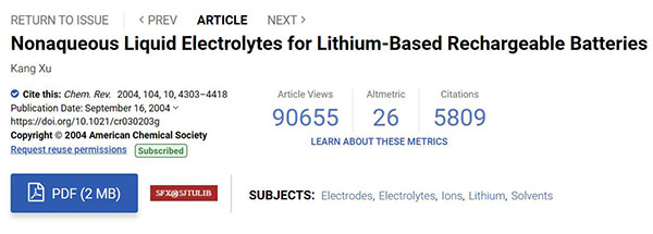 相关论文以“Nonaqueous Liquid Electrolytes for Lithium-Based Rechargeable Batteries”为题发表在Chem. Rev.。(被引次数:7751)