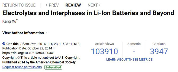 相关论文以“Electrolytes and Interphases in Li-Ion Batteries and Beyond”为题发表在Chem. Rev.。(被引次数:4556)