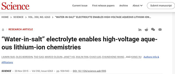 相关论文以““Water-in-salt” electrolyte enables high-voltage aqueous lithium-ion chemistries”为题发表在Science。(被引次数:3017)
