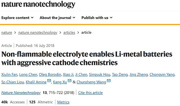 相关论文以“Non-flammable electrolyte enables Li-metal batteries with aggressive cathode chemistries”为题发表在Nature Nanotech.。(被引次数:1106)