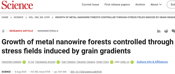 原文详情:Growth of metal nanowire forests controlled through stress fields induced by grain gradients (Science 2024, 385, 641-646)
