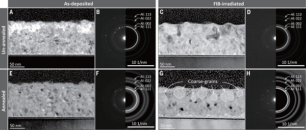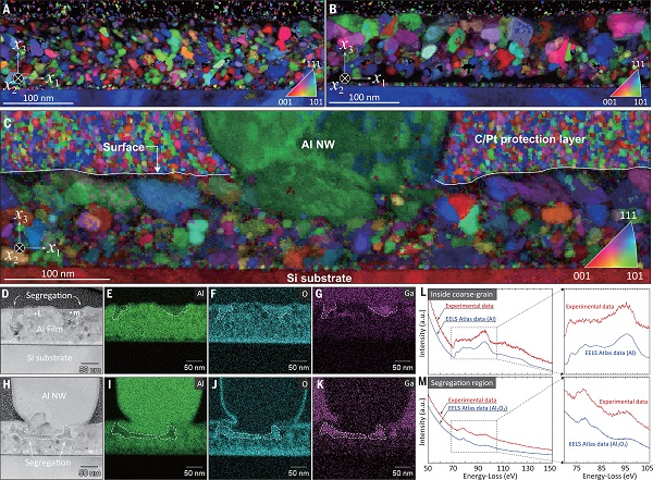 综上,本研究提出了一种Al NW forests的生长技术,该技术克服了大规模生产高度有序的单晶金属纳米线的传统挑战。基于FIB辐照的局部晶粒粗化增强了驱动力并形成了纳米线生长的核心。通过晶粒梯度导航生长路径的应力场、与方向相关的局部弹性极限各向异性以及扩散蠕变受到FIB照射诱导的局部晶粒粗化以及O和Ga杂质的偏析控制。可以在所需位置以类似于碳纳米管和半导体NW的方式构建密集的金属NW forests。与其他无序平面网络NW不同,高密度且垂直生长的单晶Al NW forests可以广泛用于各种高性能纳米器件,如气体传感器、生物标记和光电子组件。