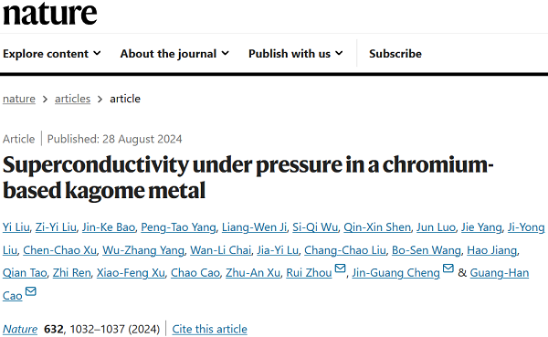 原文详情:Superconductivity under pressure in a chromium-based kagome metal (Nature 2024, 632, 1032-1037)