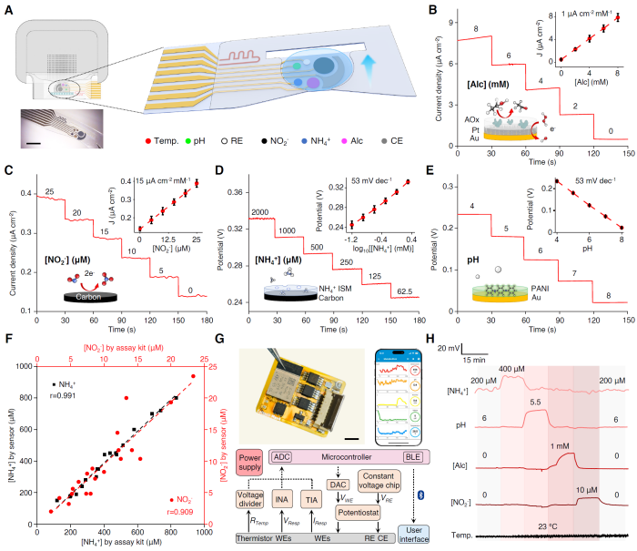 液体传输环节借鉴了生物仿生学原理,模仿植物体内液体从根部自主流向叶片的机制。研究人员利用聚偏二甲基硅氧烷(PDMS)的可重构性,构建了具有密度和高度梯度的微柱和微通道阵列,形成了具有毛细力梯度的结构。这种设计能够稳定、持续地更新EBC的流动,甚至不受重力方向的影响。电化学传感器被巧妙地集成在这些自主流动的微流体通道内,实现了稳定、持续的监测。此外,受树叶蒸腾压力的启发,该装置还利用冷却水凝胶作为”人造树叶”,产生蒸发压力,吸收已经检测过的EBC液体,并将其作为冷却水源的补充。这种循环设计大大提高了系统的持续工作能力。