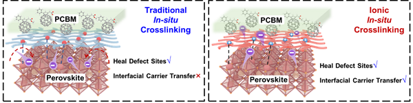 对此,西北工业大学陈睿豪和王洪强教授等人提出并验证了一种界面交联苯并咪唑(ICB)策略。该策略通过在钙钛矿上界面引入一种阳离子聚合物,成功解决钙钛矿表面缺陷的问题,同时凭借其分子的特性增强了界面电荷的提取与传输,实现导电钝化的作用。这一创新不仅显著提高倒置钙钛矿太阳能电池及模组的效率和稳定性,也为钙钛矿光伏领域的未来发展提开辟了新的方向。