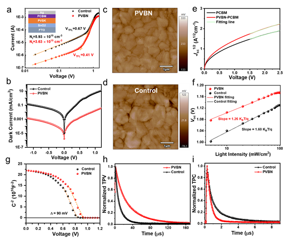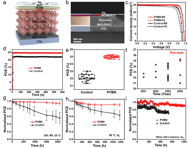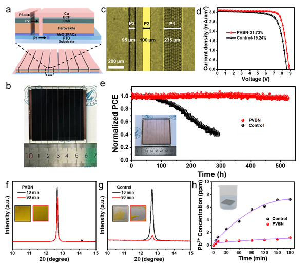 研究结果表明,PVBN分子有效地钝化了钙钛矿表面缺陷,释放了薄膜表面的残余应力,从而显著降低了界面缺陷密度。此外,PVBN的引入改善了PCBM的导电性和电子迁移率,增强了界面电荷传输,进而提高了电荷提取效率和薄膜质量。最终,经过PVBN修饰的倒置PSC实现了25.30%的光电转换效率(PCE),而6×6 cm2的倒置模组也实现了21.73%的PCE。这些器件表现出优异的稳定性,在85℃持续加热1200小时后仍能保持90%的初始性能,并在持续光照1200小时后维持92.8%的初始效率。此外,修饰后的器件的铅泄漏抑制率达到83.6%。这些成果不仅突显了ICB策略在提高钙钛矿光伏稳定性和效率方面的巨大潜力,还为可持续的大规模应用提供了可行的解决方案。